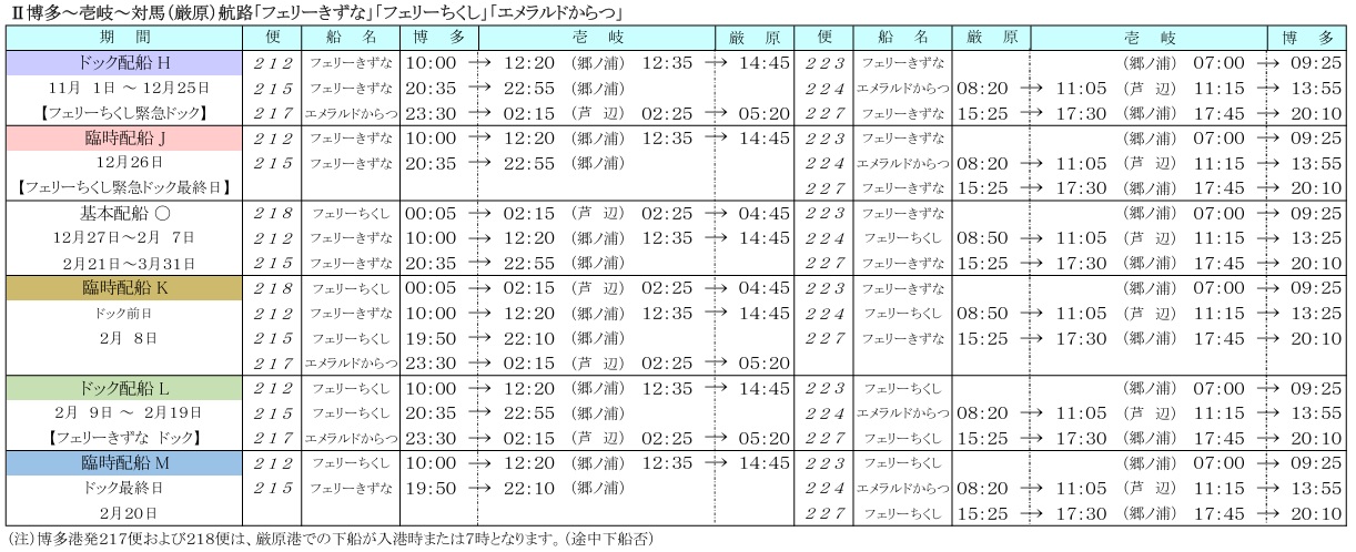 標記の件につきまして、「フェリーちくし」発電機不具合に伴い、8月18日より博多~壱岐~対馬航路(フェリー)及び唐津~印通寺航路において、緊急ドック配船を実施させていただいておりますが、復旧工事が当初の見込みより早期に完了する見通しとなりましたので、12月26日(金)を最終ドック配船とし、12月27日(土)より基本配船となりますことをご案内申し上げます。