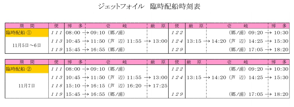 11月7日午前中まで「ヴィーナス2」1隻体制にて運航し、午後から2隻体制となり、11月8日からは基本配船となりますことをお知らせいたします。