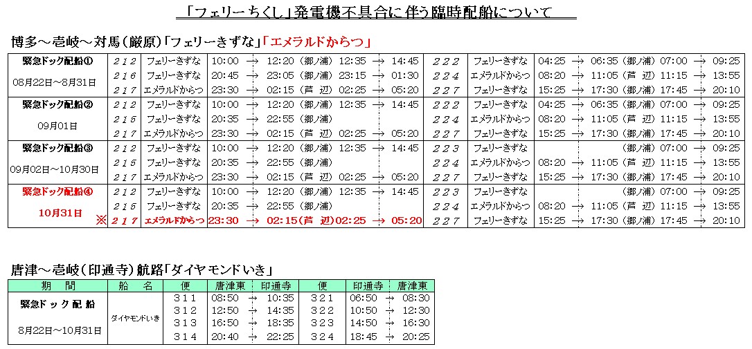 この度、11月1日より予定されていた芦辺港岸壁(可動橋)工事が、来年度へ延期されることになりました。それに伴い10月31日(金)博多発の配船が変更となります。