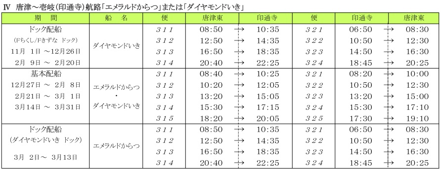 標記の件につきまして、「フェリーちくし」発電機不具合に伴い、8月18日より博多~壱岐~対馬航路(フェリー)及び唐津~印通寺航路において、緊急ドック配船を実施させていただいておりますが、復旧工事が当初の見込みより早期に完了する見通しとなりましたので、12月26日(金)を最終ドック配船とし、12月27日(土)より基本配船となりますことをご案内申し上げます。