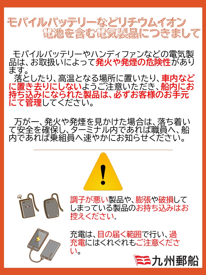 【重要】モバイルバッテリーなどのお持ち込みにつきまして 2025年11月20日 お客様各位 平素より弊社航路のご利用を賜り、有難く厚く御礼申し上げます。 モバイルバッテリーなどの電気製品のお持ち込みに関しまして重要なお知らせが御座いますので、ご乗船前に必ずご確認の程お願い申し上げます。 一覧へ